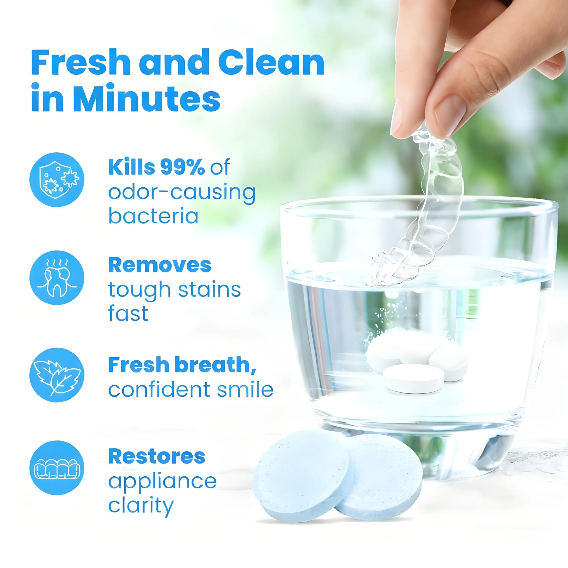 - Simple Operation: No need for ultrasonic cleaners or special tools. Just dissolve the cleaning tablet in water and soak the dental appliance. Both the elderly and students can use it easily.